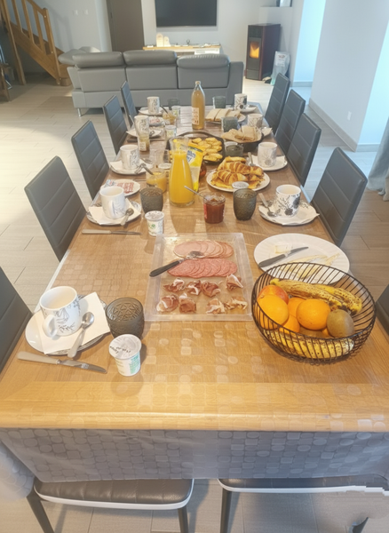 A generous breakfast featuring local/regional and homemade products, served in a large, bright common room.